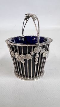 A SILVER OPEN WORK BASKET WITH BLUE GLASS LINER, LONDON 1965, MAKER C J VANDER LTD.