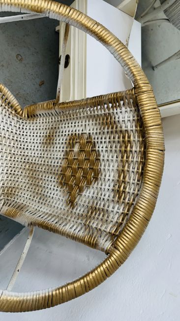 PAIR OF WOVEN TUB CHAIRS & CHEVAL DRESSING MIRROR WITH DRAWER BASE.