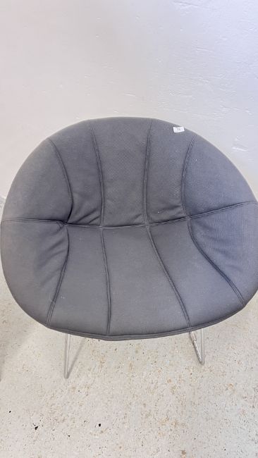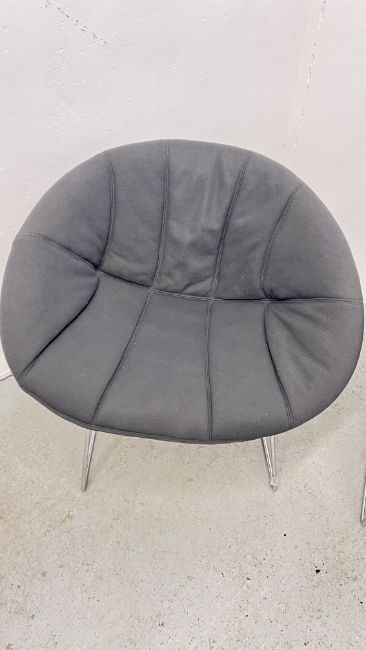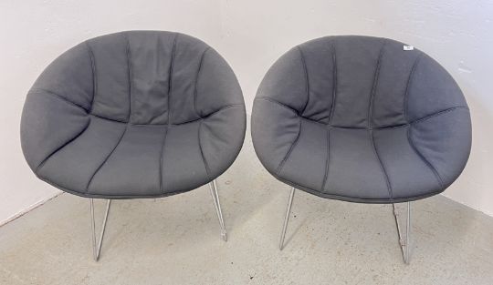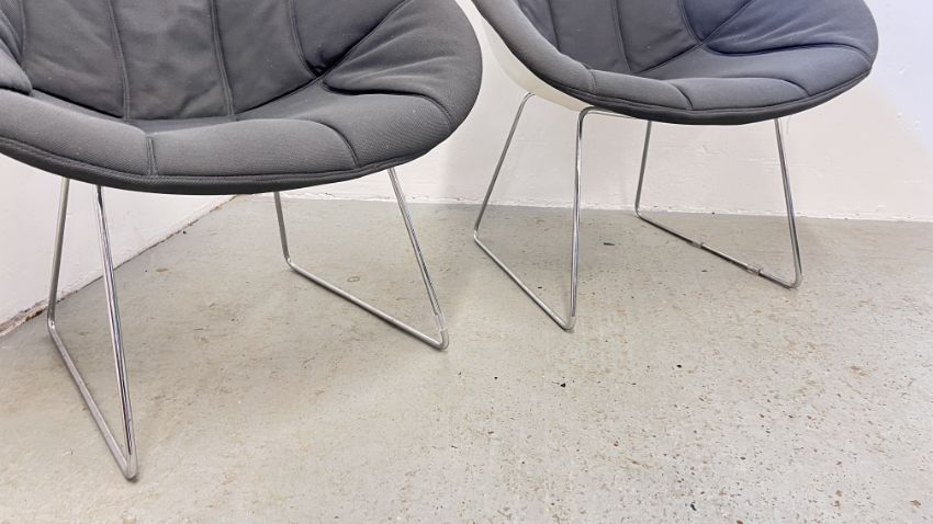 A PAIR OF PEDRALI GLISS LOUNGE 340 ARMCHAIRS WITH SLED BASE AND DARK GREY FABRIC UPHOLSTERY.