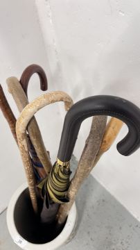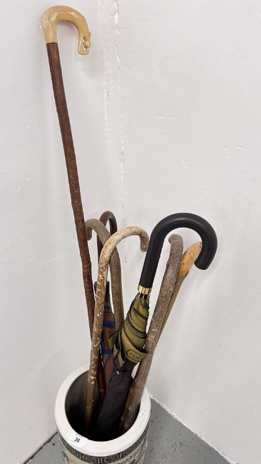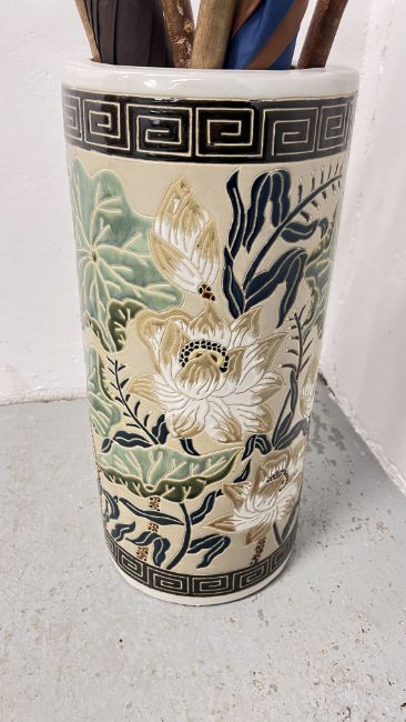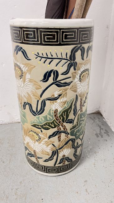 A CERAMIC STICK STAND DECORATED WITH FLORAL DESIGNS AND CONTENTS TO INCLUDE HORN HANDLED WALKING STICK AND UMBRELLAS.