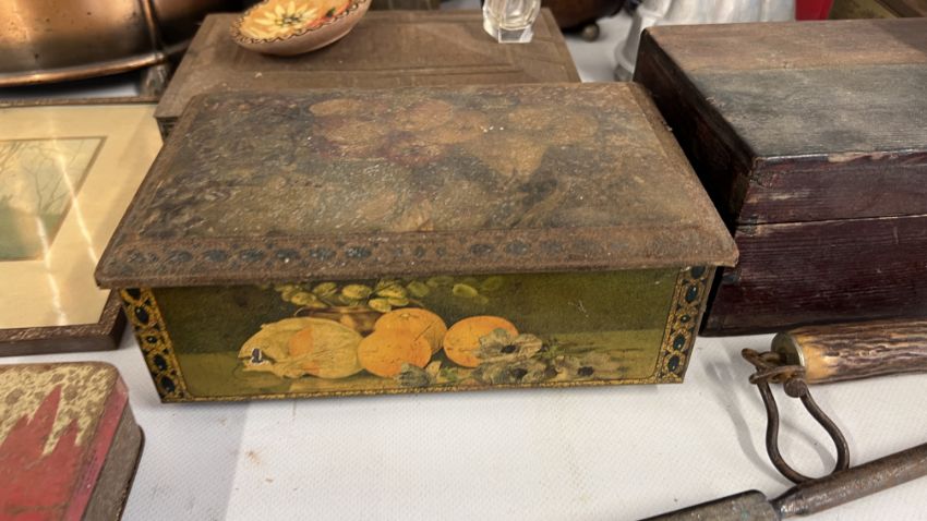 A BOX OF COLLECTABLES TO INCLUDE TINS, CADDY IN THE FORM OF A BARREL + A PAIR OF VINTAGE FRAMED AND MOUNTED ORIENTAL DUCK WATERCOLOURS, BEARING MONOGRAM, VINTAGE SCALES AND CAST PAN STAMPED J&J SIDDONS WEST BROMWICH 8 INCH, ETC AND COAL BUCKET.
