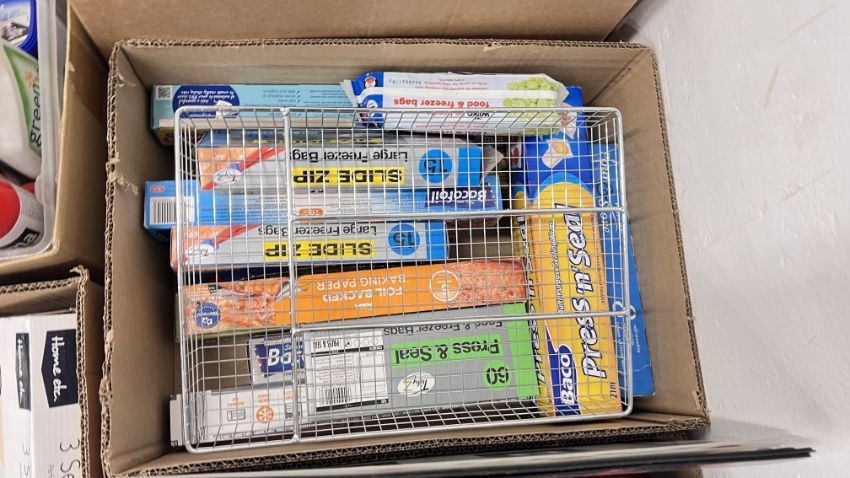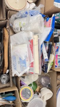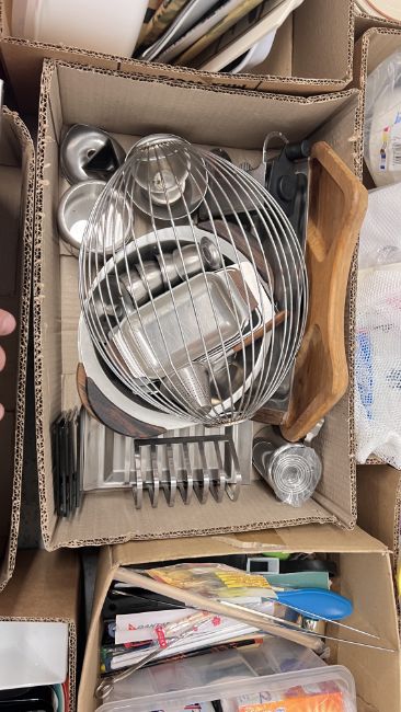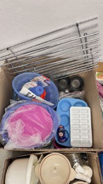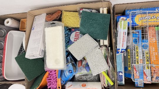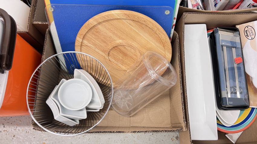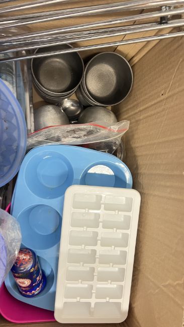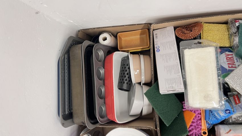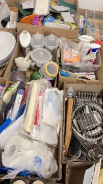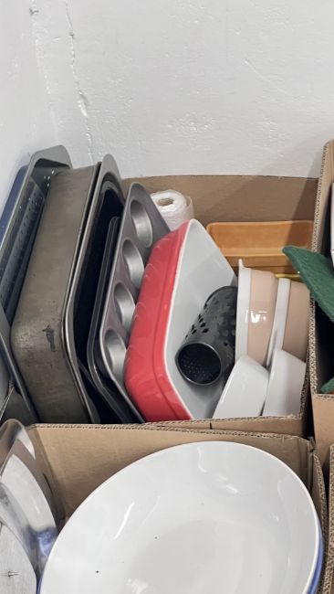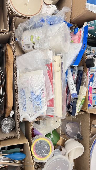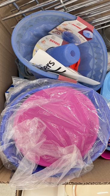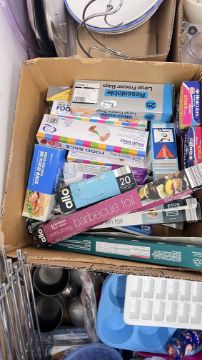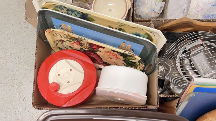 15 X BOXES OF ASSORTED KITCHENALIA TO INCLUDE OVEN TRAYS, PLACEMENTS, VARIOUS CHOPPING BOARDS, ASSORTED STAINLESS STEEL WARES, LARGE GROUP OF FREEZER BAGS, FOOD BAGS, KITCHEN FOIL, BRILLO PADS, CURVER COOL BOX, PESTLE & MORTAR, AMONG OTHER EXAMPLES.