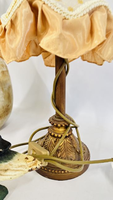 A CLASSICAL MODERN LAMP WITH A VINTAGE STYLE FRINGED SHADE ALONG WITH A LARGE STUDIO POTTERY VASE BEARING AN IMPRESSED MAKER'S MARK + A CAST DUCK DOOR STOP.