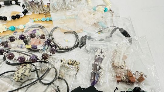 A BOX OF GEMSTONE EARRINGS, NECKLACES AND BRACELETS.