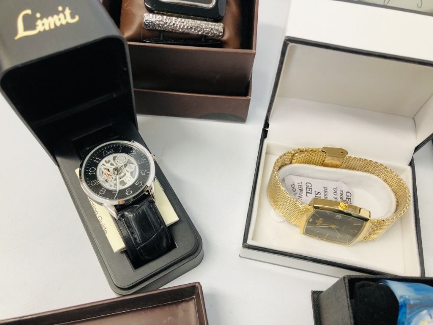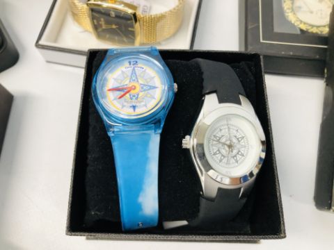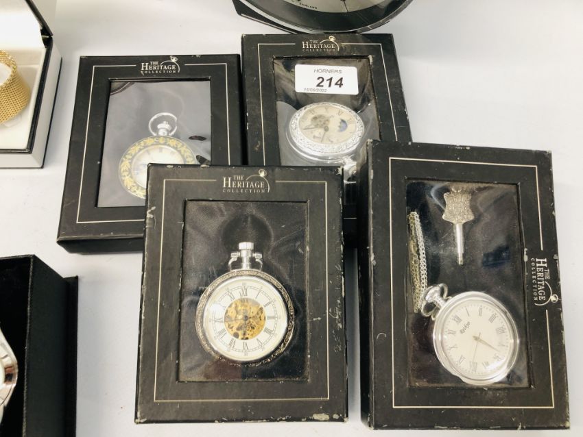 QUANTITY OF DESIGNER BRANDED WRIST WATCHES TO INCLUDE EDEN AND FOUR BOXED HERITAGE COLLECTION POCKET WATCHES, ETC.