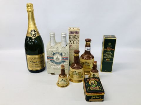 MAGNUM OF PREMIUM CHAMPAGNE, 2 BOTTLES OF COMMEMORATIVE LAGER (COLLECTORS ITEM ONLY) AND TWO FURTHER, PLUS JACK DANIELS PLAYING CARDS AND FOUR WADE WHISKY BELLS (EMPTY)