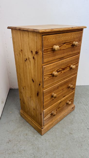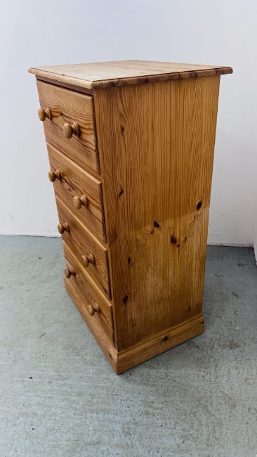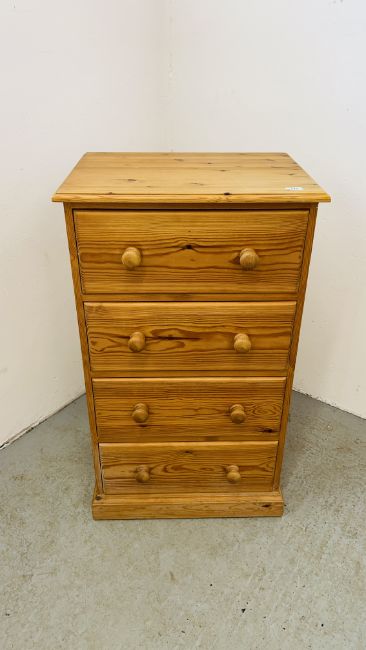 A SOLID PINE WAXED FINISH FOUR DRAWER CHEST WIDTH 61CM. DEPTH 45CM. HEIGHT 106CM.