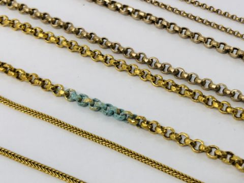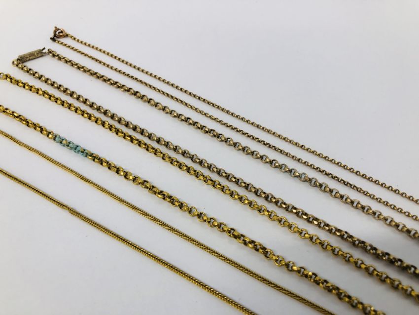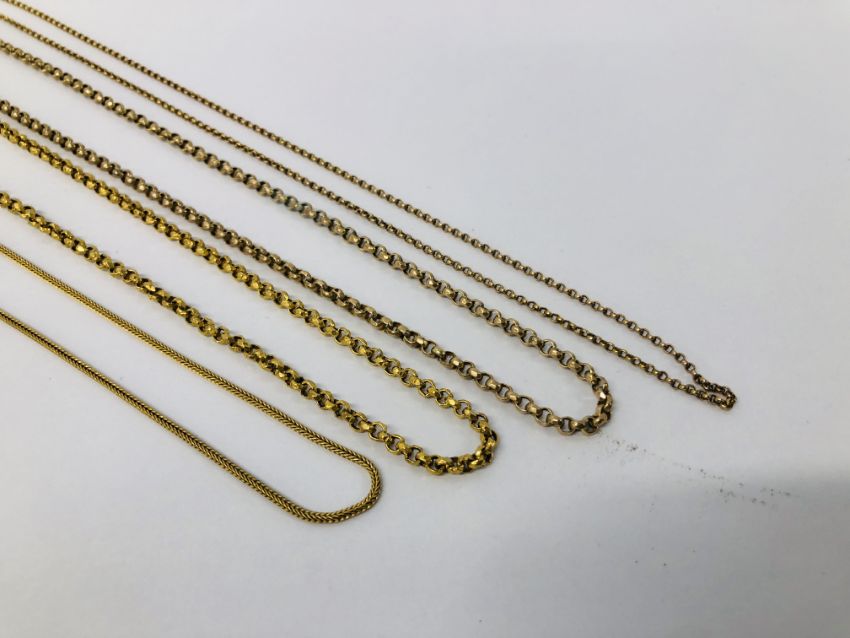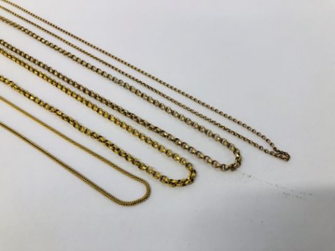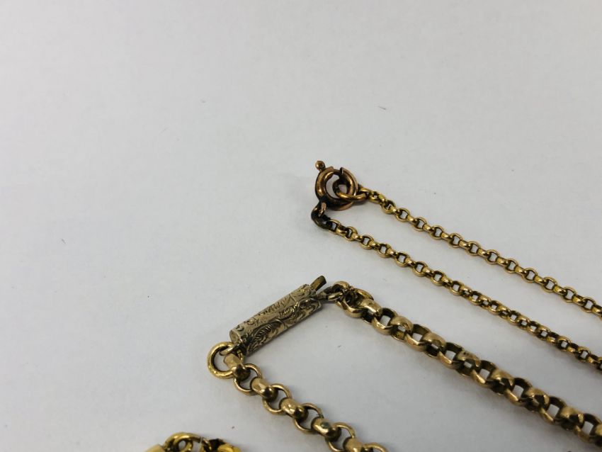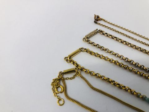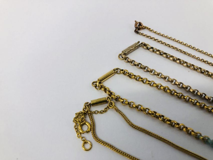 FOUR VARIOUS YELLOW METAL NECKLACES - NO VISIBLE HALL MARKS