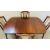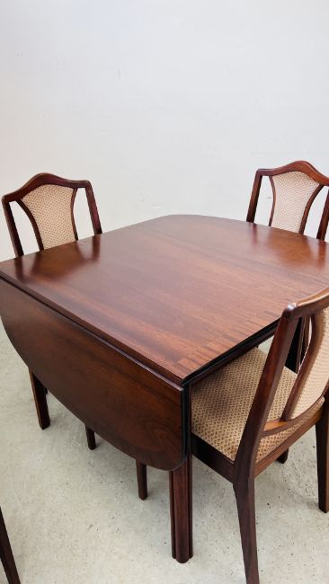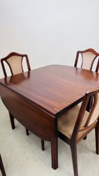 A GOOD QUALITY MAHOGANY FINISH DROP FLAP DINING TABLE AND SET OF FOUR DINING CHAIRS TABLE EXTENDED 96XM. X 142CM.