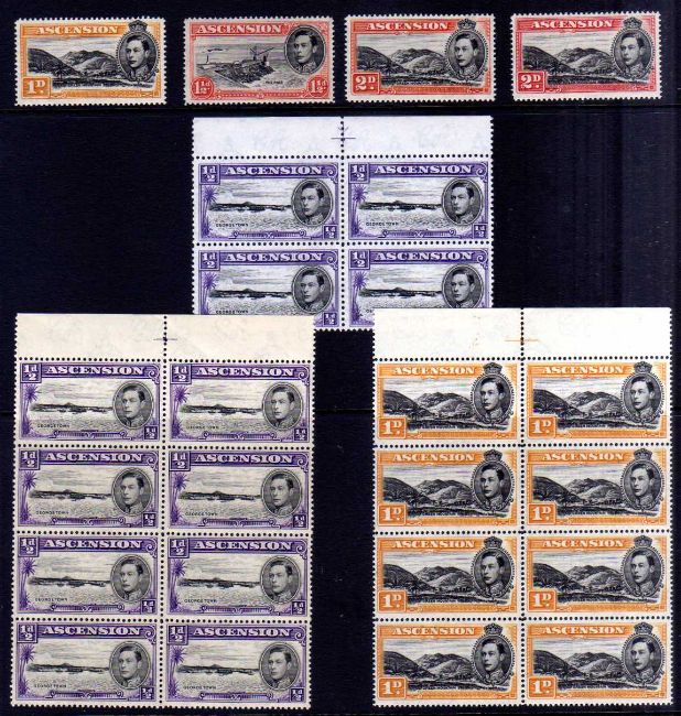 ASCENSION: 1938-53 SELECTION OF VARIETIES IN POSITIONAL BLOCKS OR SINGLES, ½d 'LONG CENTRE BAR TO E' (BOTH PERFS), 1d 'MOUNTAINEER' FLAW PERF 14 WITHIN BLOCK AND A SINGLE, 1½d PERF 14 'DAVIT' FLAW, 2d PERF 14 'MOUNTAINEER' FLAW (BOTH COLOURS), MAINLY MNH SG 38a, 38ba, 39ca, 40ca, 41ba, 41ca.