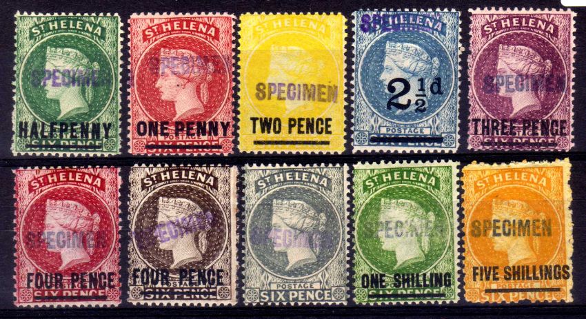 St HELENA: c1893 PRESENTATION SET OF TEN TO 5/- OG OR PART OG, ALL OPT. LOCAL 'SPECIMEN' TYPE SH2, 2d, 4d CARMINE AND 1/- ARE CROWN CC WMK, OTHERS CROWN CA. (10)