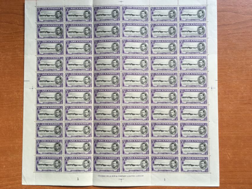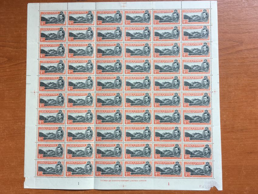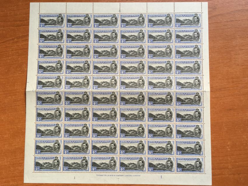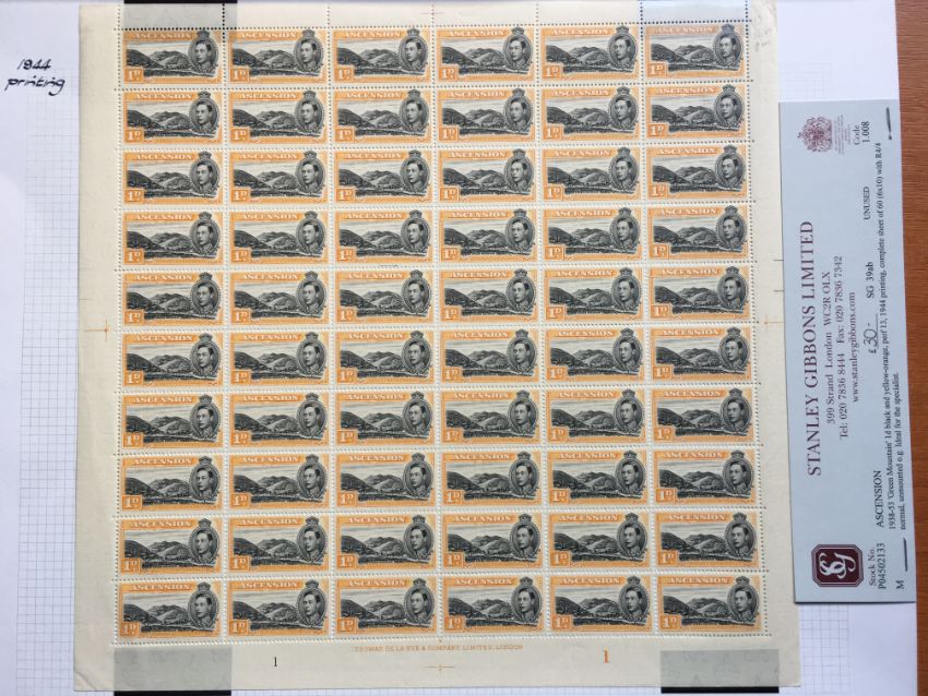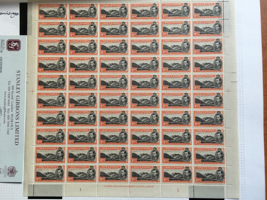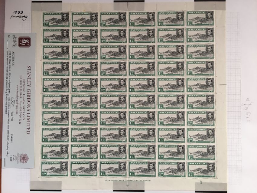 ASCENSION: 1938-53 COMPLETE SHEETS OF 60 COMPRISING ½d PERF 13½ (2, BOTH WITH 'LONG CENTRE BAR TO E' VARIETY), 1d PERF 13, 1d BLACK & GREEN PERF 13, 2d BLACK & RED-ORANGE PERF 13, PERF 14 SHOWING 'MOUNTAINEER' FLAW ON R4/4, 2d BLACK-SCARLET PERF 14 SHOWING 'MOUNTAINEER' FLAW ON R4/4, 4d PERF 13½. SG 38, 38b, 38ba, 39ab, 39d, 41a, 41b, 41ba, 41c, 41ca, 42c.