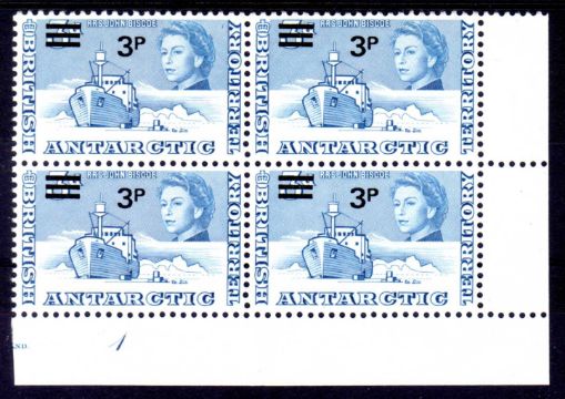 BRITISH ANTARCTIC TERRITORY: 1971 3p ON 3d MNH PLATE BLOCK OF FOUR INVERTED WATERMARK. SG 29w.