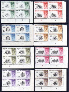 FALKLAND ISLANDS: 1955-7 AND 1960-6 WATERLOW SETS IN MAINLY MNH PLATE BLOCKS OF FOUR, SOME FOLDED PERFS AND COUPLE STAMPS ARE OG, ALL WITH HINGE MARKS IN MARGINS. SG 187-192, 193-207. (21 BLOCKS).