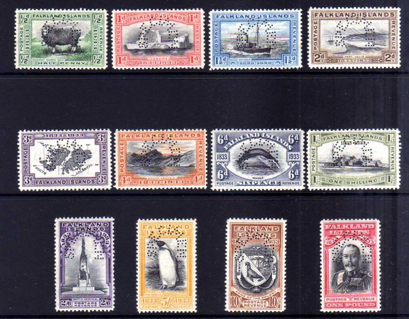 FALKLAND ISLANDS: 1933 CENTENARY SET OG PERF 'SPECIMEN', EACH WITH SMALL VIOLET HANDSTAMP ON REVERSE 'COLLECCION OFFICUR/MARRUECOS/ZONA ESPANOLA'. A FEW WITH GUM TONING. SG 127s-138s. (12).