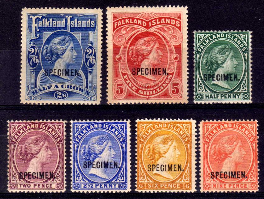 FALKLAND ISLANDS: 1891-8 SPECIMEN TYPE B2 OG COMPRISING 1891-1902 SET OF FIVE AND 1898 HIGH VALUES, GUM A LITTLE TONED. SG 15s, 26s, 27s, 33s, 35s, 41s, 42s.
