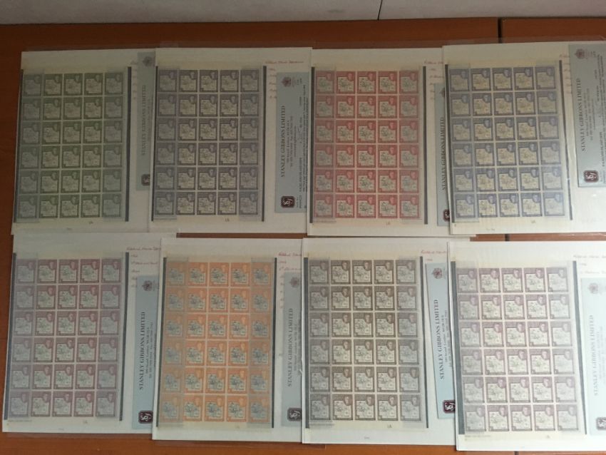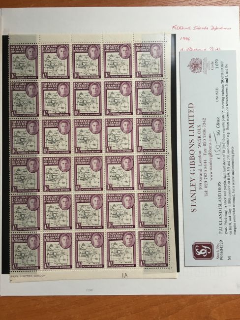 FALKLAND ISLANDS DEPS: 1946-9 THICK MAP SET IN RIGHT HALF SHEETS, MNH WITH TRIMMED MARGINS, THE ½d, 4d, 9d AND 1/- SHOWING 'SOUTH POKE' VARIETY, THE 6d BLOCK SHOWING 'EXTRA ISLAND' AND 'DOT BY OVAL' VARIETIES, FEW CREASES. SG G1-G8 (8 BLOCKS).