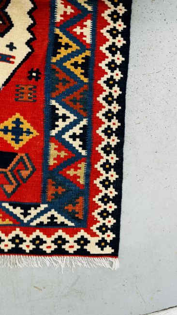 A RED / GREEN / BLUE AZTEC PATTERNED CARPET 140CM X 190CM.
