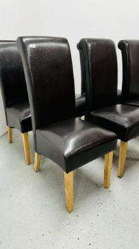 A SET OF 6 AS NEW DESIGNER FAUX LEATHER DINING CHAIRS WITH NATURAL WOOD LEGS.