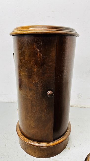 THREE CYLINDRICAL MAHOGANY POT CUPBOARDS WITH INSET WHITE MARBLE TOPS.