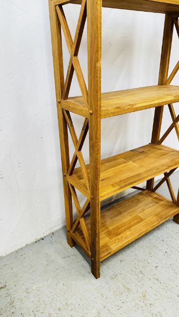 A MODERN SOLID LIGHT OAK FIVE TIER SHELVING UNIT, W 70CM X D 30CM X H 198CM.