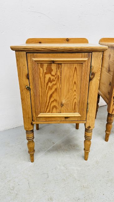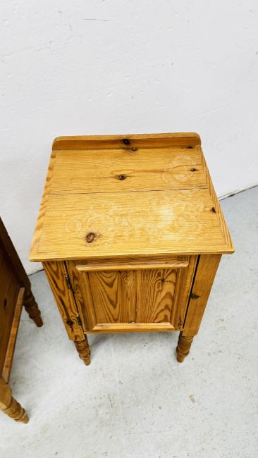 A PAIR OF PINE WAXED FINISH SINGLE DOOR BEDSIDE CABINETS.
