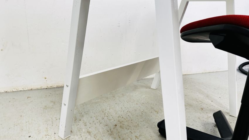 A MODERN STEEL FRAMED HOME OFFICE DESK WITH GLASS TOP, 100CM X 70CM, ALONG WITH A GOOD QUALITY REVOLVING OFFICE CHAIR.