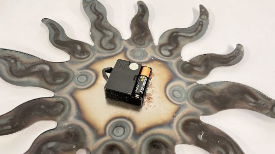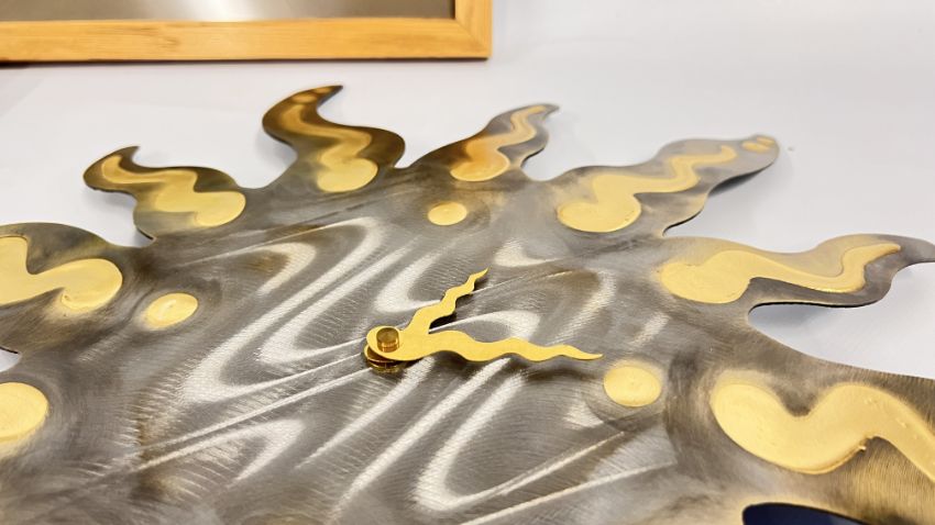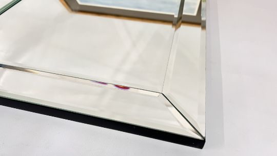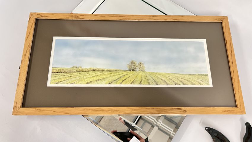 A MODERN FRAMELESS WALL MIRROR 50CM X 50CM PLUS A LIMITED EDITION OAK FRAMED PRINT OF CORNFIELD BEARING INITIALS SMR # 2/100 + RICHARD PELL SUNBURST WALL CLOCK, HEIGHT 48CM.