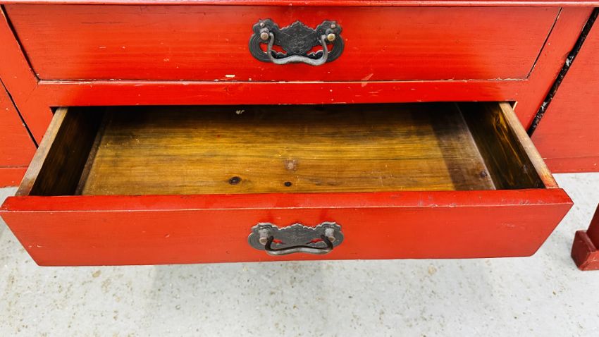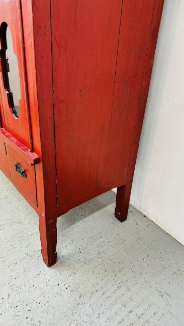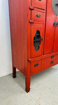 A RUSTIC PAINTED ORIENTAL DESIGN "WEDDING CHEST" W 127CM D 55CM H 178CM.