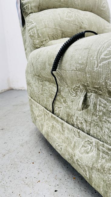 A CARECO GREEN UPHOLSTERED ELECTRICALLY OPERATED RISE AND RECLINE EASY CHAIR - SOLD AS SEEN.