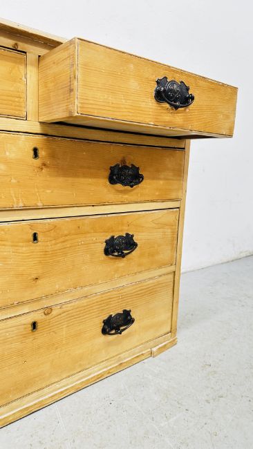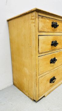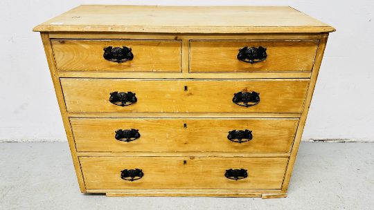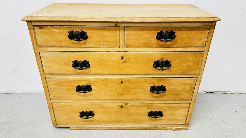 A C19th FIVE DRAWER STRIPPED PINE CHEST, LACKING BASE, 94CM WIDE.