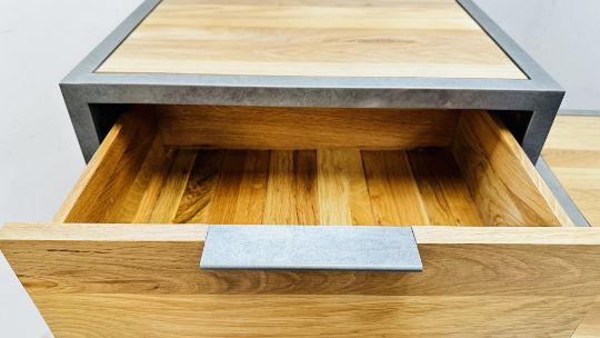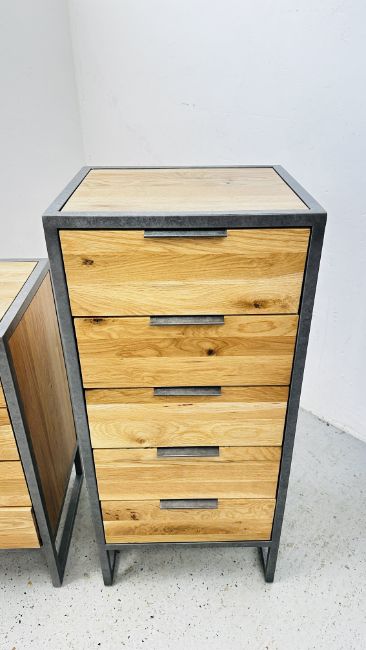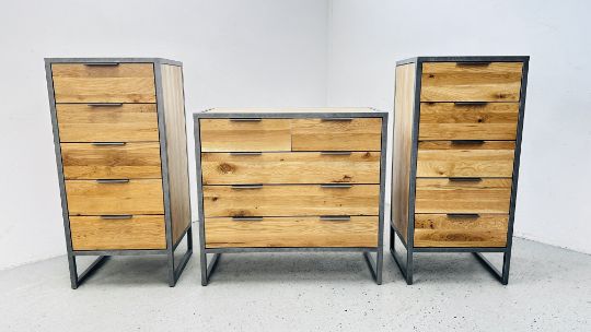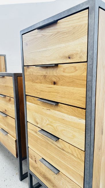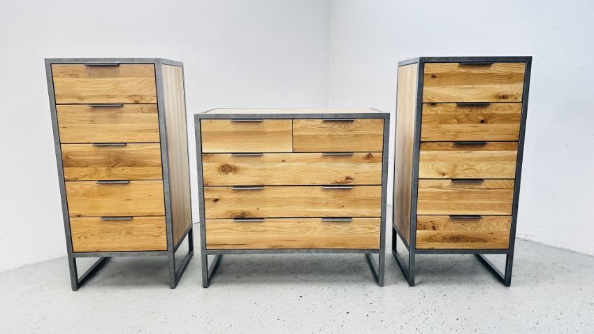 THREE PIECES OF OAK FURNITURE LAND BEDROOM FURNITURE TO INCLUDE BROOKLYN NATURAL SOLID OAK AND METAL TWO OVER THREE DRAWER CHEST AND PAIR OF FIVE DRAWER TALL BOYS.