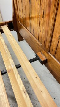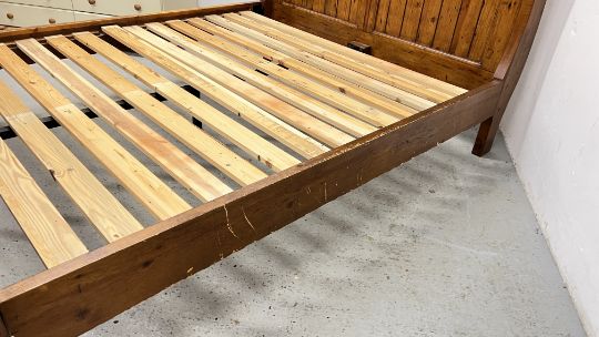 A SOLID STAINED PINE KING SIZE SLEIGH BED (MARKED).