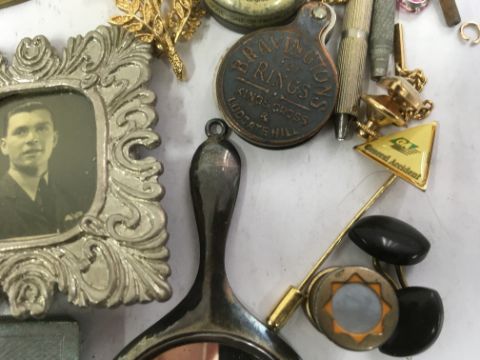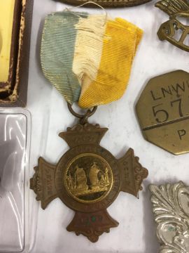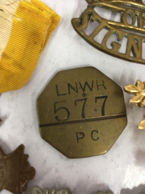 MISC COLLECTIBLES: SMALL BOX VARIOUS INCLUDING L.C.D. THE KING'S MEDAL IN BOX OF ISSUE, ROYAL CORPS OF SIGNALS SHOULDER TITLES, LNWR TOKEN, SILVER COIN BROOCH, VICTORIAN STAMP CASE ETC.