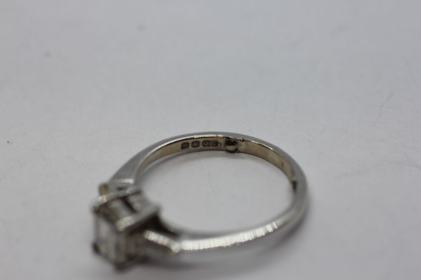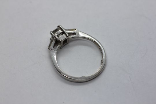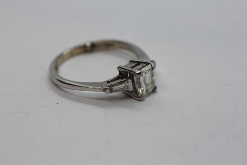 AN 18CT WHITE GOLD ENGAGEMENT RING SET WITH EMERALD CUT DIAMOND WITH DIAMOND TAPERED BAGUETTE SHOULDER STONES EITHER SIDE.