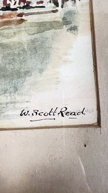 A PAIR OF FRAMED AND MOUNTED WATERCOLOUR PAINTINGS, ONE TITLED 'EARLY MORNING ON THE RIVER AT BECCLES' SIGNED W. SCOTT READ, THE OTHER TITLED 'A QUIET CORNER' SIGNED W.B 59.