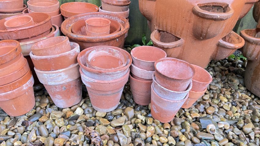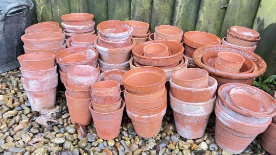 LARGE COLLECTION OF APPROX 75 TERRACOTTA GARDEN POTS OF VARYING SIZES, TWO TERRACOTTA STRAWBERRY JARS AND TWO VINTAGE GALVANISED METAL WASH TUBS.
