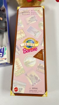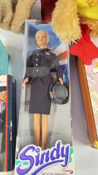 A BOX OF VINTAGE TOYS TO INCLUDE PADDINGTON BEAR, KERMIT THE FROG, A COLLECTION OF BRITISH AIRWAYS TOYS TO INCLUDE BOXED SINDY, INTERNATIONAL TRAVEL BARBIE, BOXED LONDON 2012 OLYMPIC GAMES CONCORD, ETC.