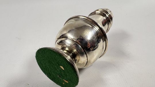 A SOLID SILVER CASTER, BIRMINGHAM 1963, MAKER A BROS LTD, H 18CM.