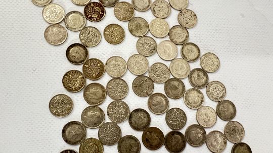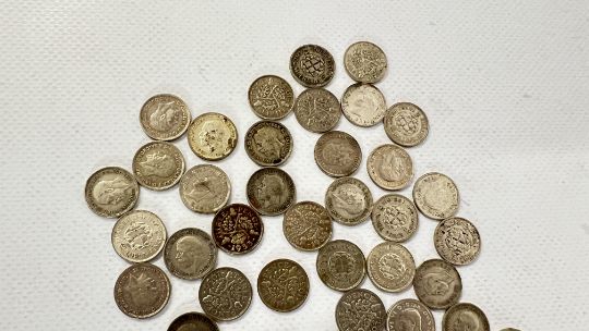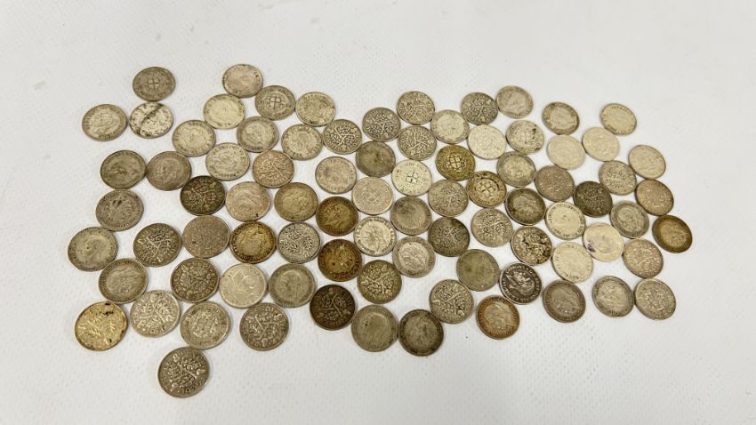 A COLLECTION OF PRE - 1947 SILVER 3D COINS (APPROX 85 IN TOTAL).