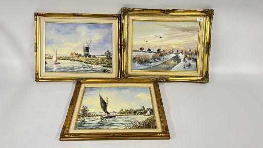 TWO FRAMED OIL ON BOARDS TITLED "THE WHERRY ALBION OFF RANWORTH" W 37 X H 30 & "ON THE YARE AT BERNEY ARMS MILL" W 40 X H 30CM BEARING SIGNATURE ROGER BEDINGFIELD + ONE OTHER TITLED "FOOTPATH TO THE MARSHES HALVERGATE" BEARING SIGNATURE PAUL SHREEVE.