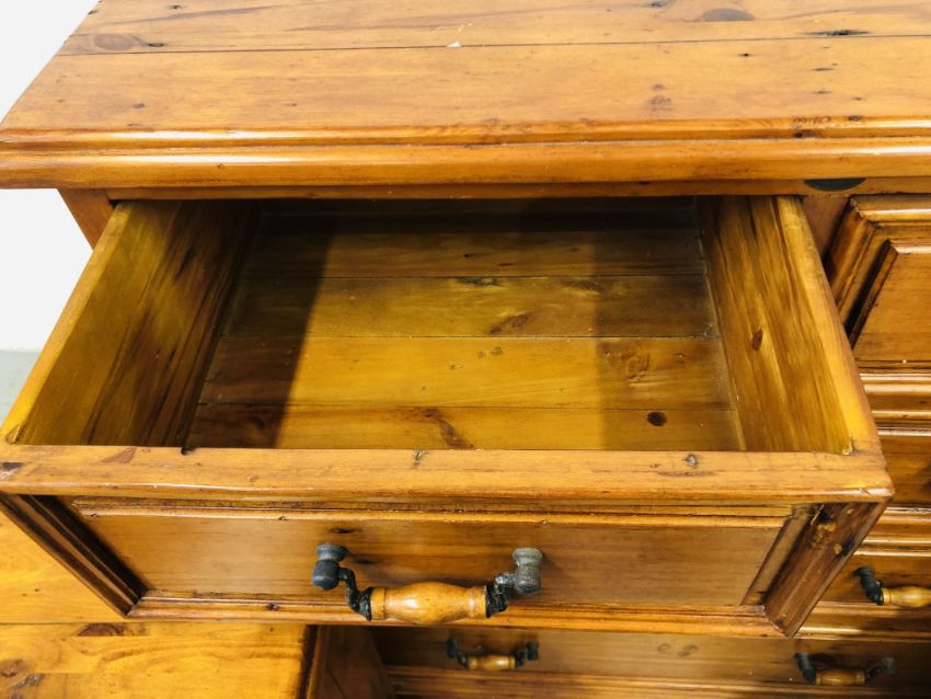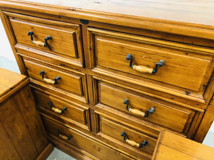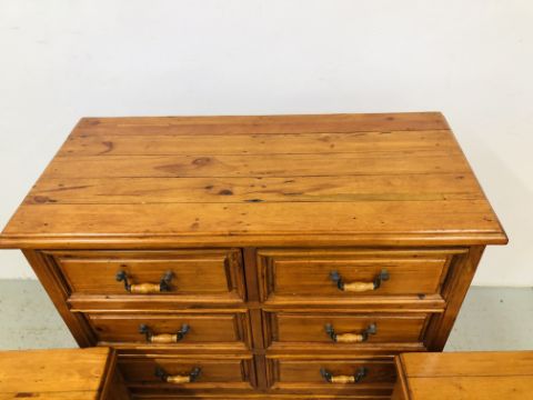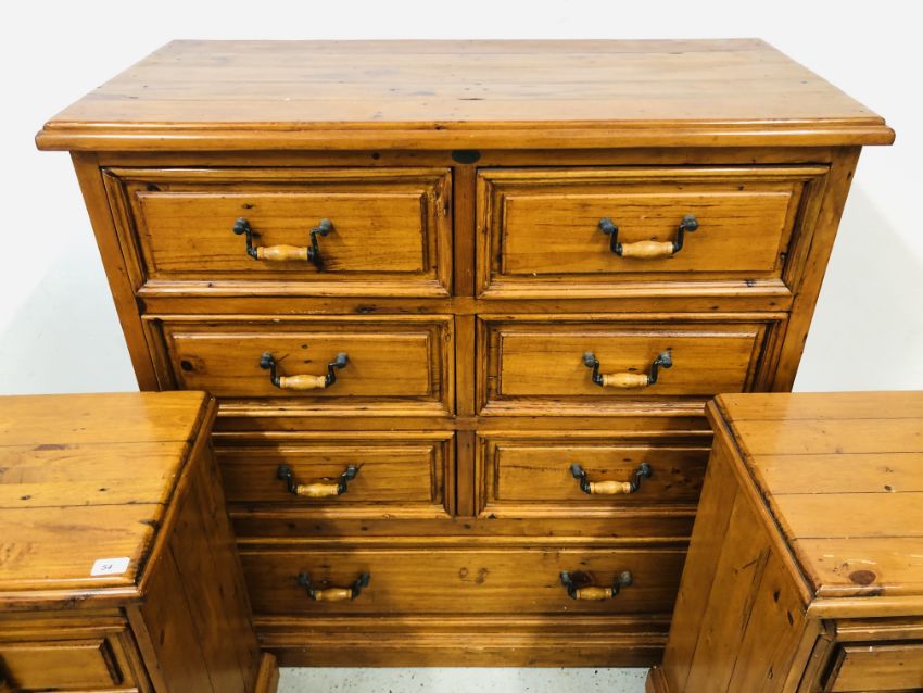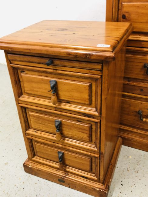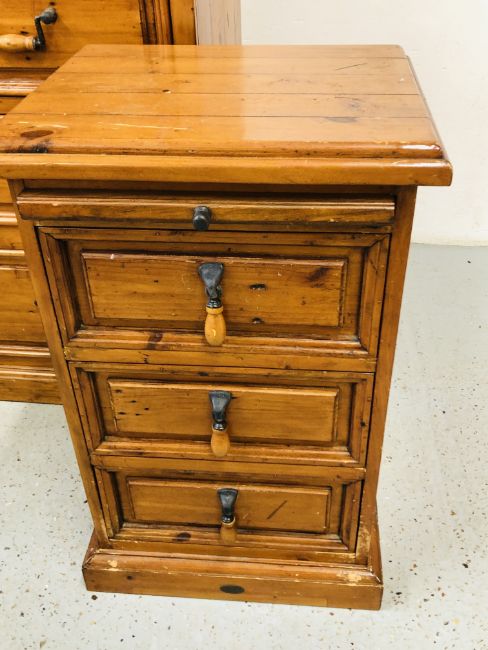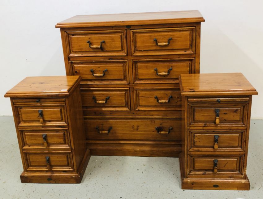 A SOLID STAINED PINE 7 DRAWER CHEST, W 110 X D 51 X H 115CM + A PAIR OF MATCHING THREE DRAWER BEDSIDE CHESTS, W 47 X D 37 X H 74CM.