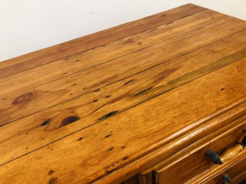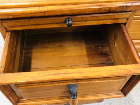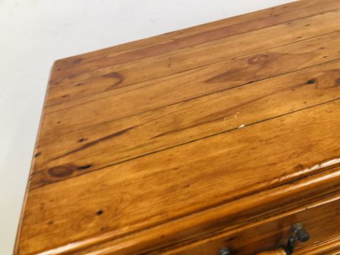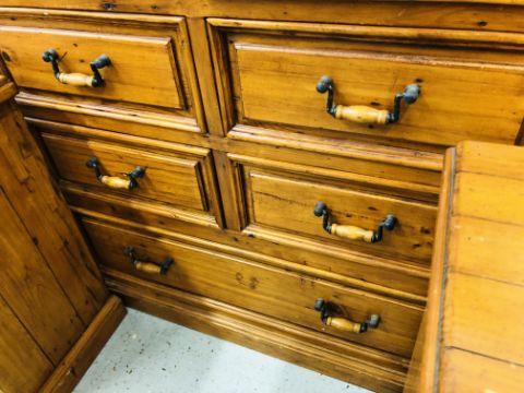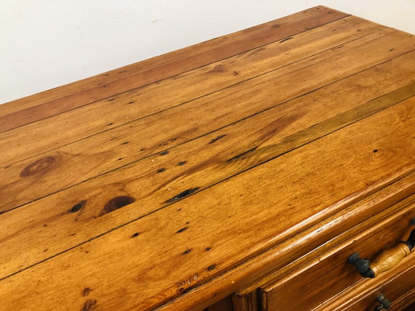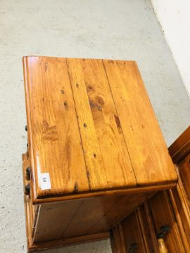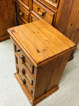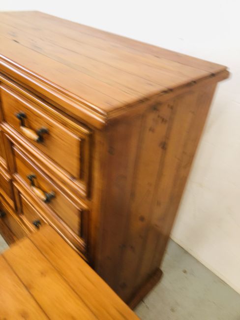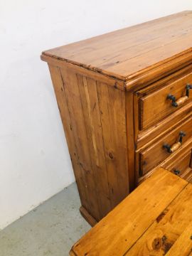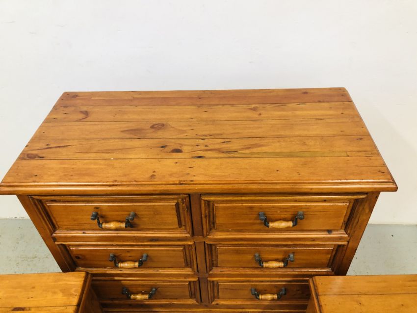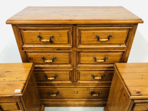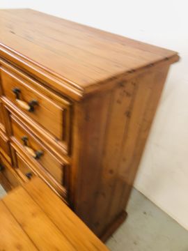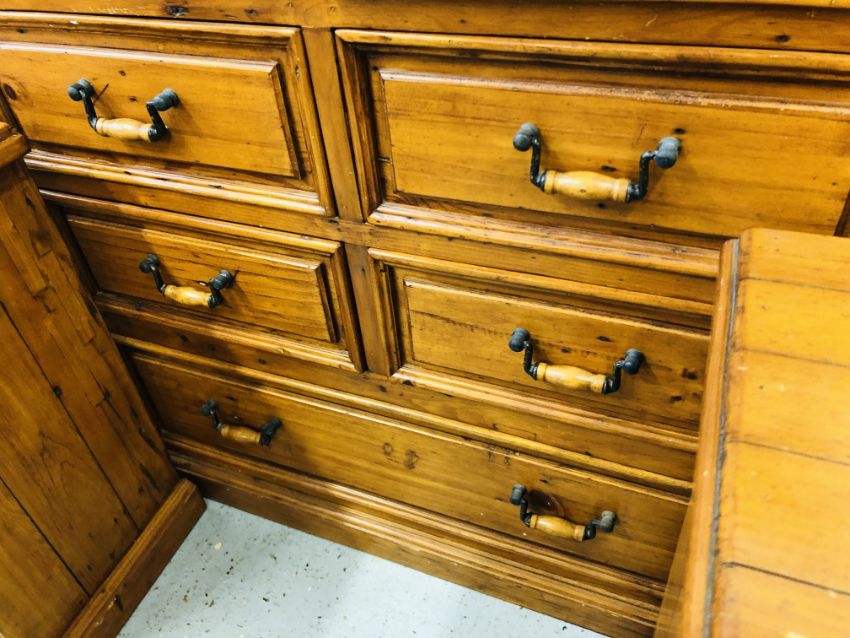 A SOLID STAINED PINE 7 DRAWER CHEST, W 110 X D 51 X H 115CM + A PAIR OF MATCHING THREE DRAWER BEDSIDE CHESTS, W 47 X D 37 X H 74CM.