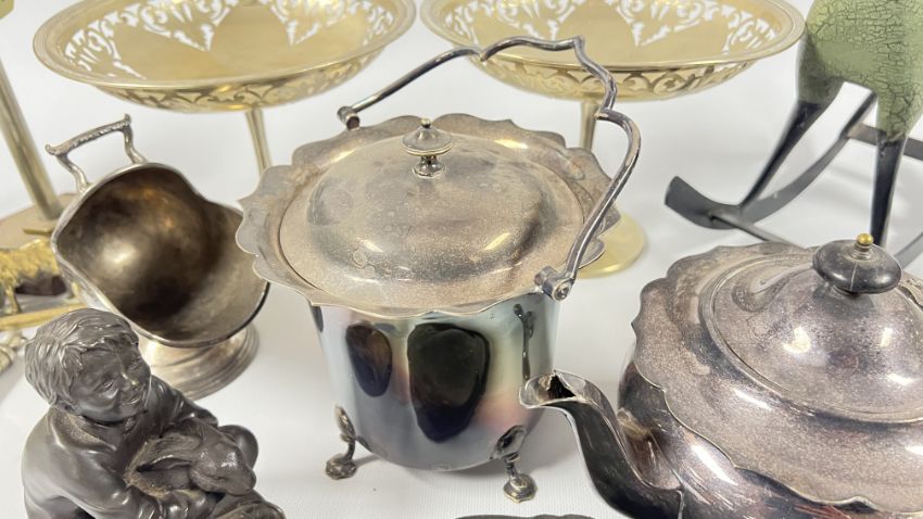 A BOX OF MIXED METAL WARE TO INCLUDE A PAIR OF OPEN WORK TAZZAS, ROCKING HORSE, 4 PIECE PLATED TEA SET + 2 BRONZED RESIN HEREDITIES FIGURES + A PAIR OF BRASS LANTERNS, TRENCH ART, THE METROPOLITAN WHISTLE, ETC.