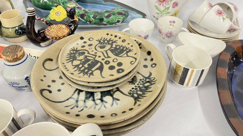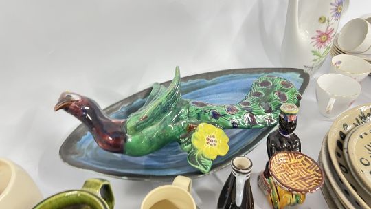 A GROUP OF SUNDRY CHINA TO INCLUDE STUDIO POTTERY EXAMPLES, MID WINTER TEA WARE, 2 X DOULTON LAMBETH POTS AND A GROUP OF ASSORTED HOLKHAM POTTERY ETC. + A GLAZED "VALLAURIS" PEACOCK PLAQUE A/F.