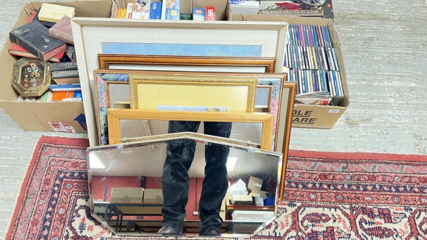 7 BOXES OF AS CLEARED BOOKS, CD'S, GAMES, RECORDS ALONG WITH 7 FRAMED PRINTS AND MIRRORS.