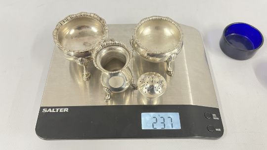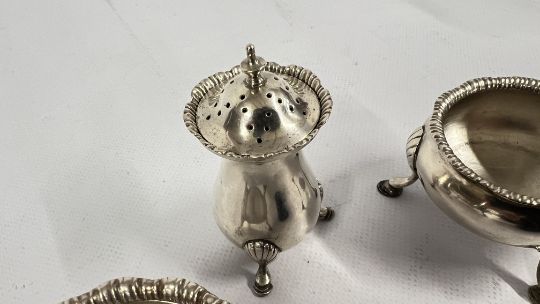 AN ANTIQUE SILVER PEPPER POT AND MATCHING SILVER SALT WITH BLUE GLASS LINER, CHESTER 1918, MAKER STOKES AND IRELAND PLUS A FURTHER SIMILAR ANTIQUE SILVER SALT WITH BLUE GLASS LINER, LONDON 1938, MAKER JADE PARKS AND Co.