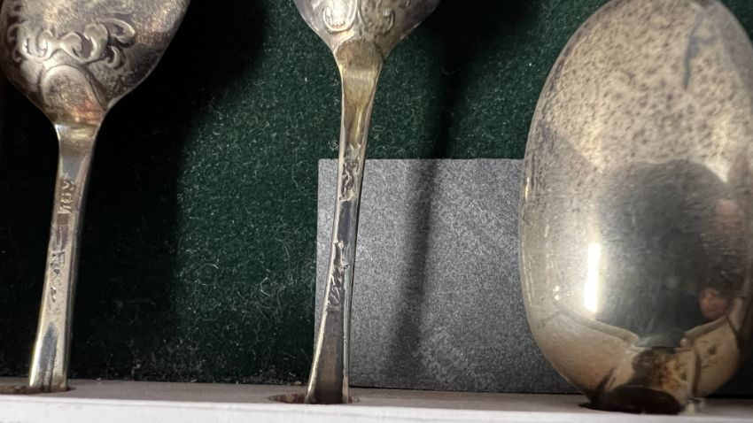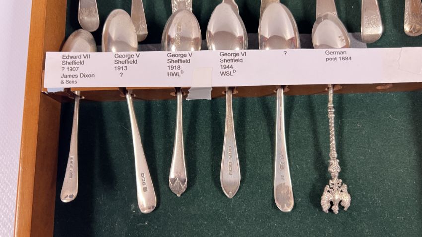 AN OAK DISPLAY CASE CONTAINING A COLLECTION OF 22 VARIOUS SILVER TEASPOONS.