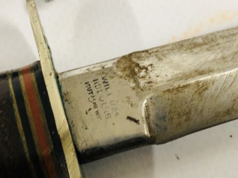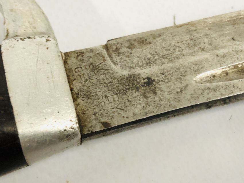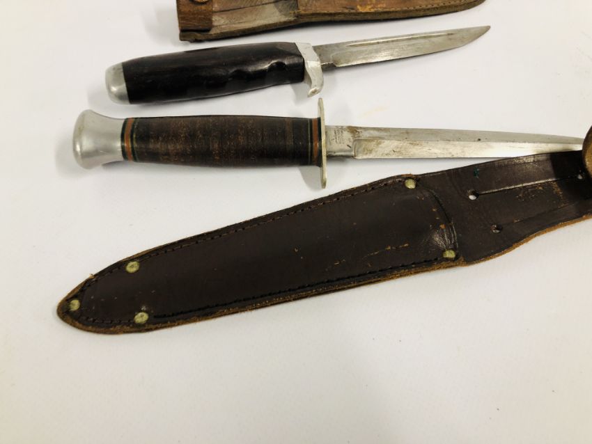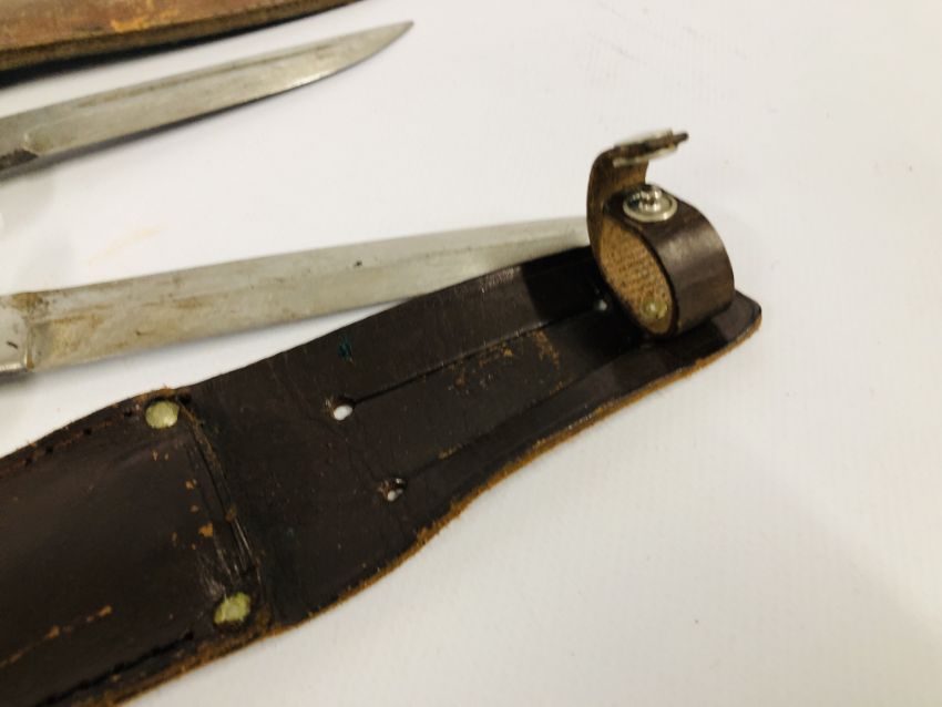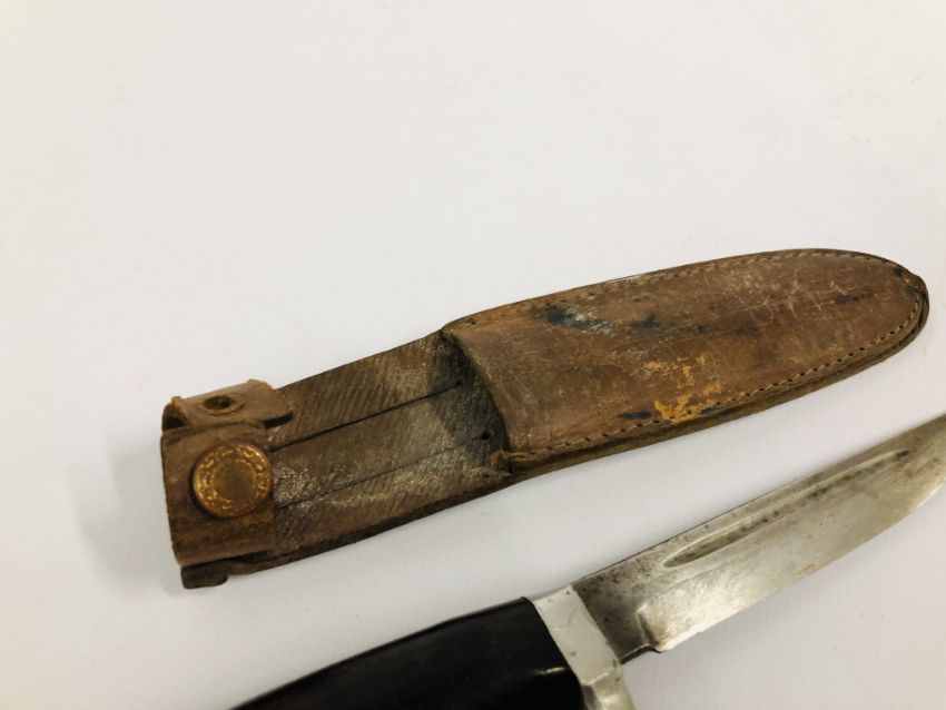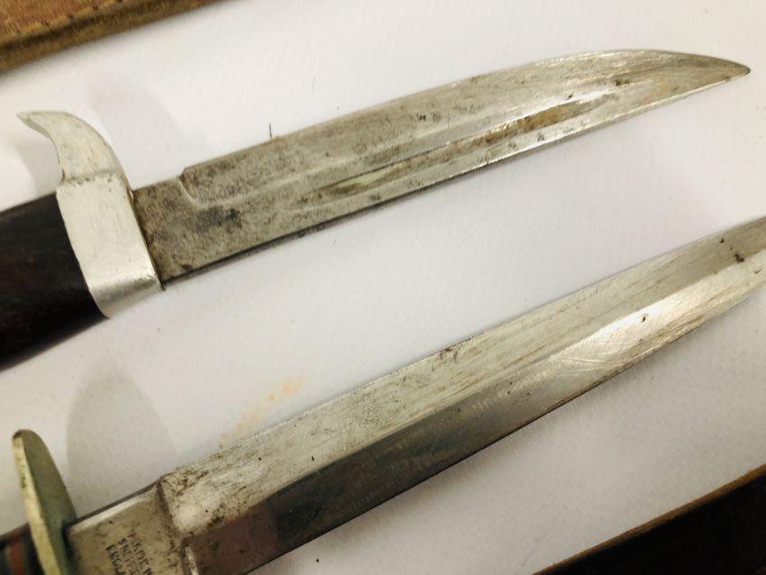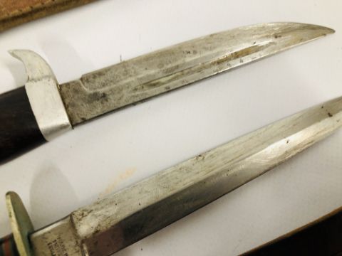 A GERMAN WHITBY SOLINGEN SCOUT KNIFE ALONG WITH A FURTHER WILLIAM ROGERS BELIEVED WW2 PERIOD HUNTING KNIFE.