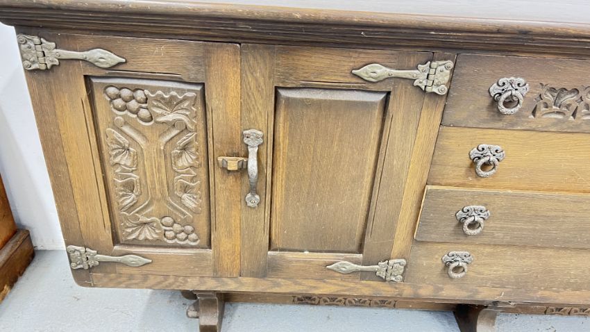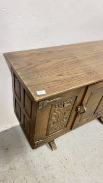 HEAVILY CARVED REPRODUCTION 4 DRAWER 2 DOOR OAK SIDEBOARD, W 187 X D 43 X H 80CM.